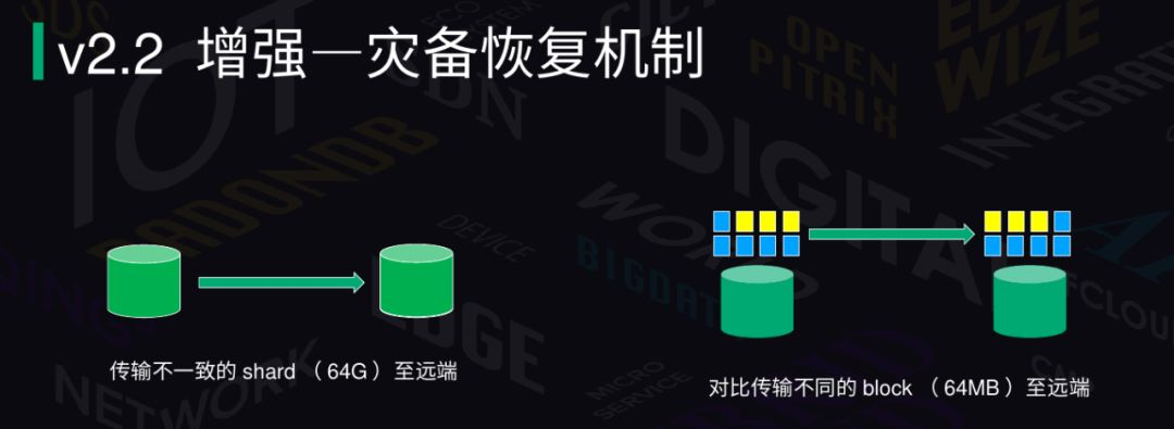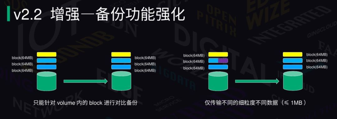 同时在备份方面也有增强,以前以 Block 的容量作为备份基准,当 Block 发生变化做备份时,如果选择增量备份,需要把整个 Block 进行拷贝。现在我们把对比颗粒度做得更细,最大不超过 1 兆。此时,做增量备份时,以兆为单位做数据复制,大幅提高备份的效率。