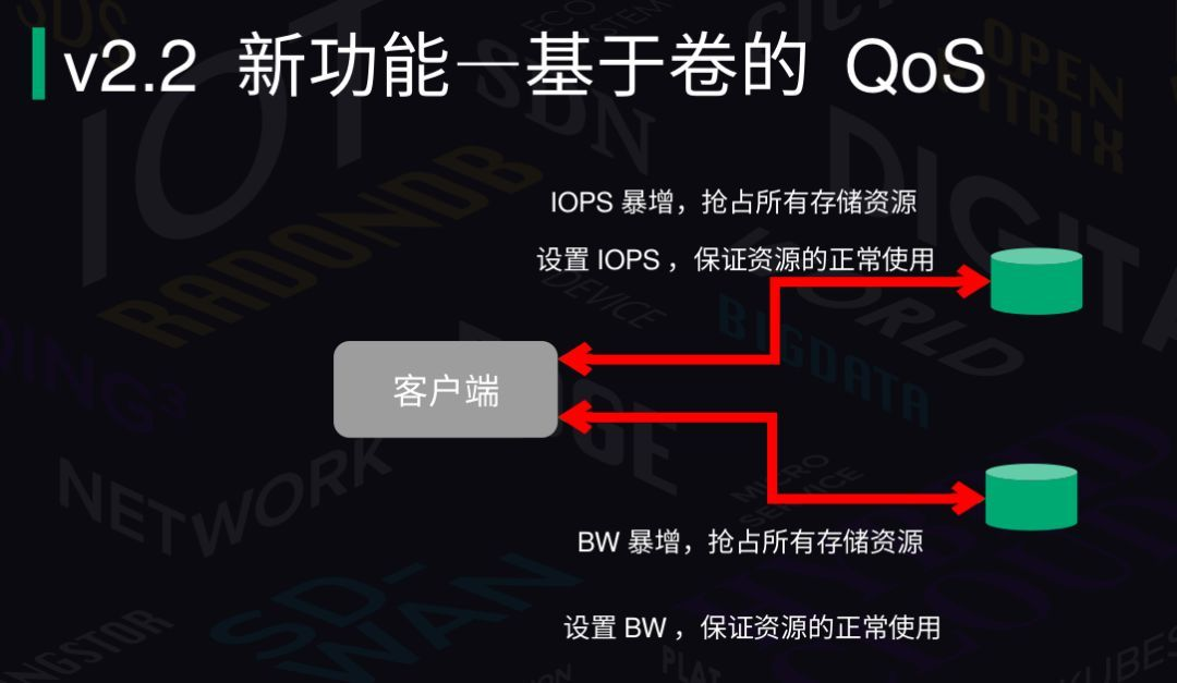 QoS 比较关键,青云是做公有云的,我们很多私有云场景里用户需要为多租户提供 QoS 服务,必须通过一些比较完善的技术确保我们存储能应对高并发的访问,基于能够针对 IOPS 和带宽做质量的控制,确保资源池的稳定和整个云平台的稳定。