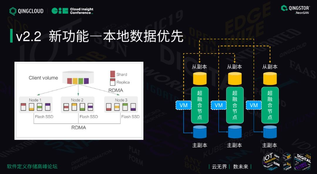 在融合部署时,可能会面临一个问题,虚拟机可能会在某一个计算节点上,但是它的盘的主副本可能在其他节点上。读的时候涉及跨网络的问题,为了解决对网络带宽的占用及提高融合架构下虚拟机的性能,我们提供了本地优先的方式,NeonSAN®️ 根据计算资源所在盘的位置把主副本跟它落在一起,读的时候不会涉及跨节点的数据访问。这样可以降低带宽,同时提高虚拟机的性能。