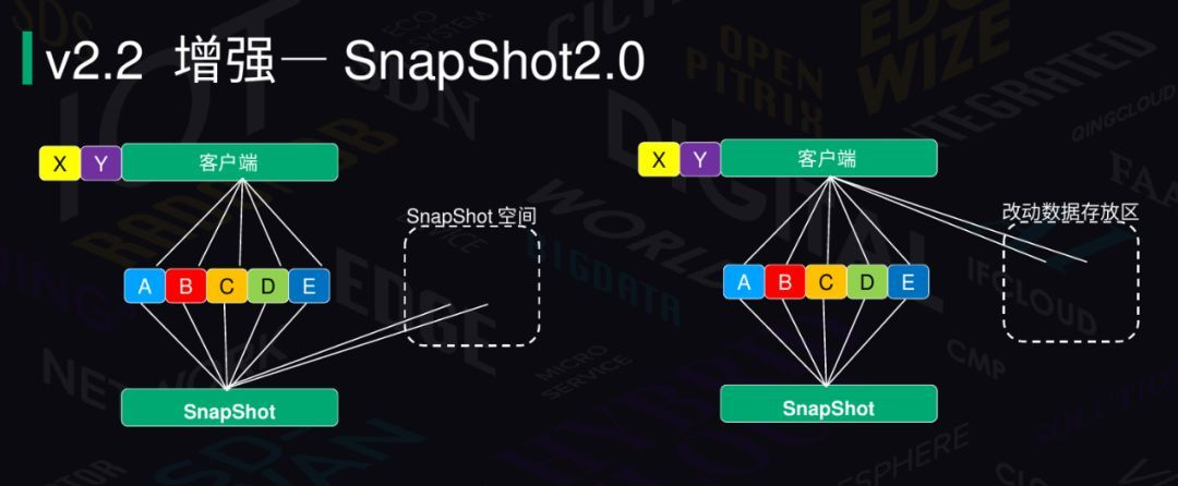 现在提供第二个方式,我们会创建一个区域——改动数据存放区,我们的快照创建时比较快,不需要做任何动作,当时的状态就保存在那里。当有新的 IO 过来时,把 IO 数据保存到改动数据区,及时记录下来,可以极大地提升创建快照效率。现在我们同时提供这两种方法,用户可以根据自己的业务场景、底层硬件配置选择采用哪种方式。