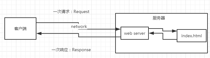 客户端通过网络向服务器发送请求,服务器接收到请求后,在自己的资源中找是否有对应的信息,若有服务器则响应给客户端。