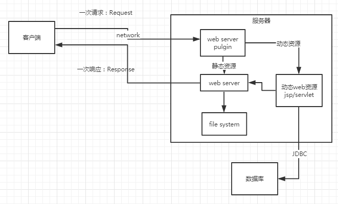 客户端向服务器发送请求,若请求的是静态资源,则在file system中找,找到后通过web server响应给客户端;若请求的是动态资源,则通过jsp/servlet渲染之后在通过web server响应给客户端。