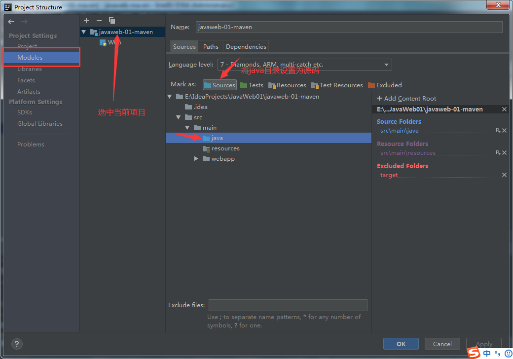将java目录改为Sources Root,将resources改为Resources Root。修改后如下: