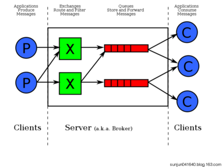 通常我们谈到队列服务,会有三个概念:发消息者、队列、收消息者,RabbitMQ在这个基本概念之上,多做了一层抽象,在发消息者和队列之间加入了交换器exchange,这样发消息者和队列就没有直接联系,转而编程发消息者把消息给交换器,交换器根据调度策略再把消息给队列。