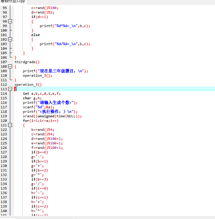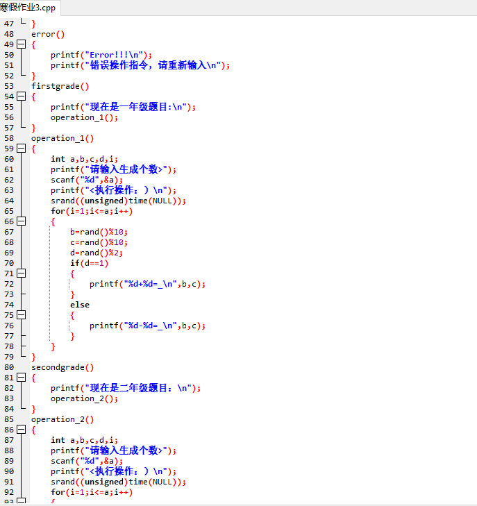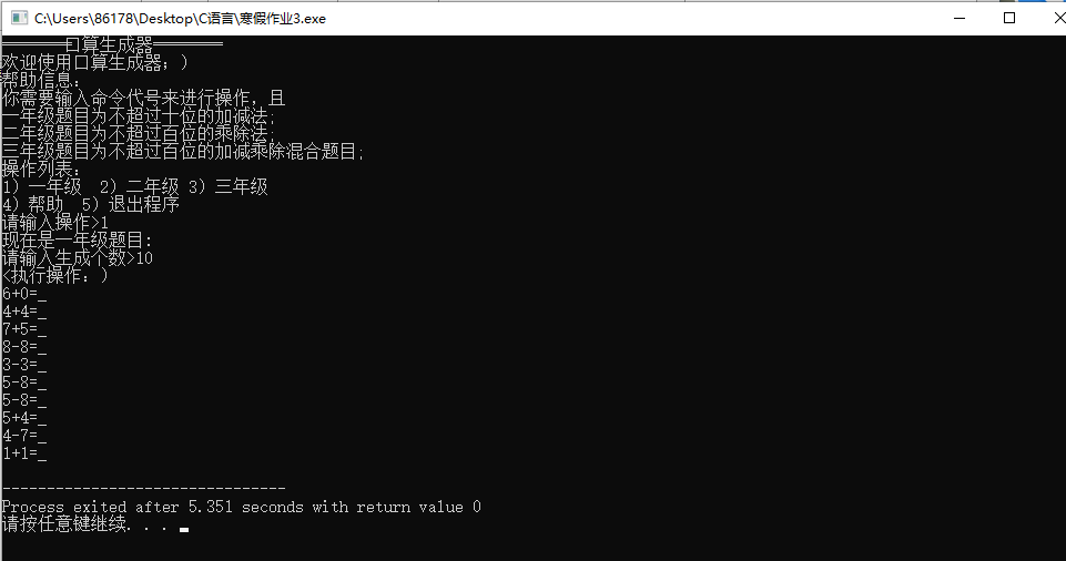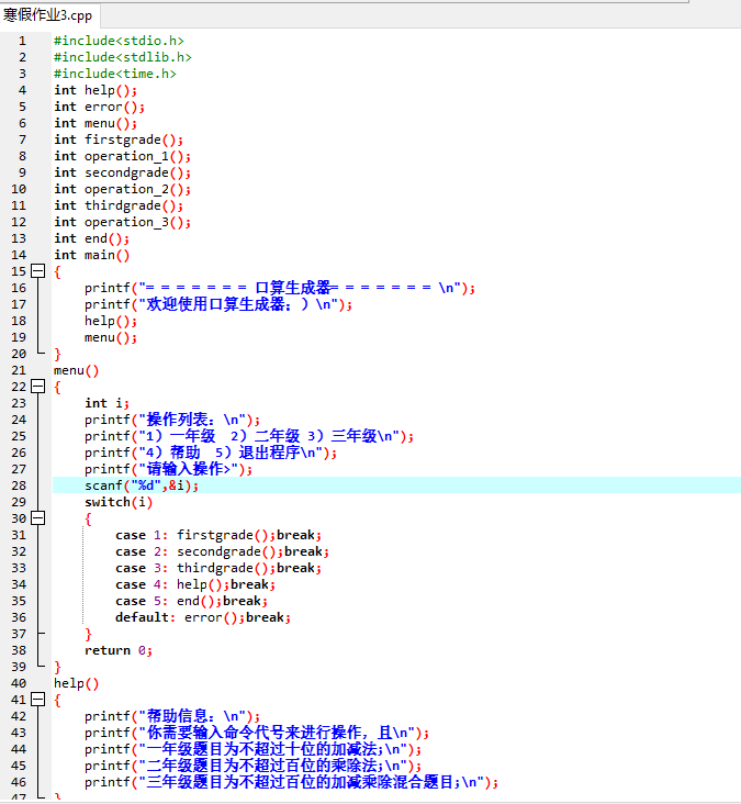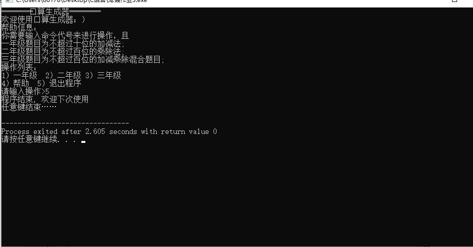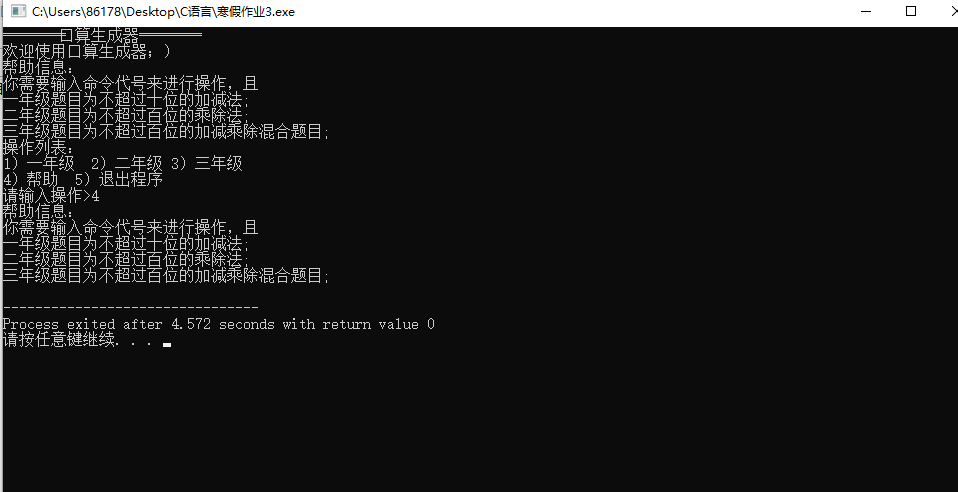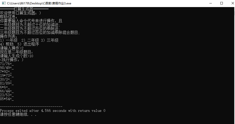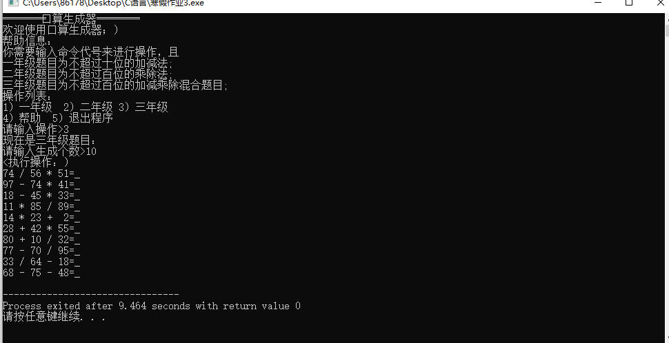 问题:三年级的题目要求除号后面不能为0,原本想要用switch函数写,后来不管我如何添加进去都无法输出,后来改成if-else函数直接写出。