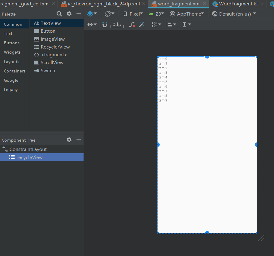 1.创建布局文件,word_fragment用来放Recycle,word_fragment_grad_cell用来放小单元