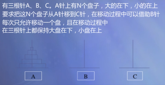 到目前为止,求解汉诺塔问题最简单的算法还是同过递归来求,我们说的简单点就是自己是一个方法或者说是函数,但是在自己这个函数里有调用自己这个函数的语句,必须有一个结束点,或者具体的说是在调用到某一次后函数能返回一个确定的值,接着倒数第二个就能返回一个确定的值,一直到第一次调用的这个函数能返回一个确定的值。