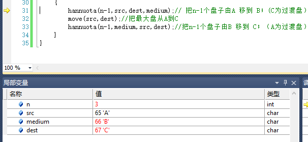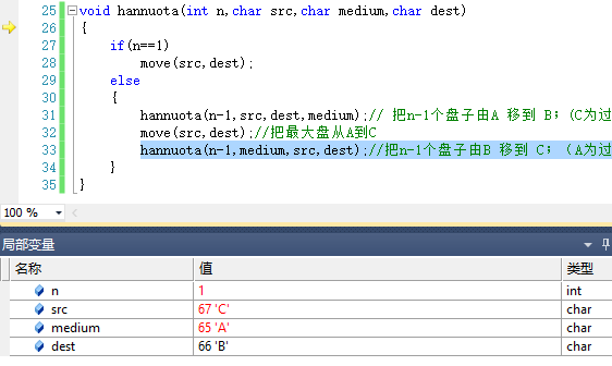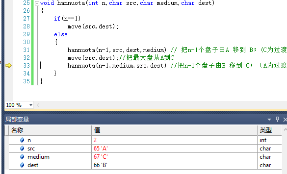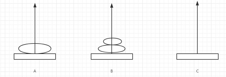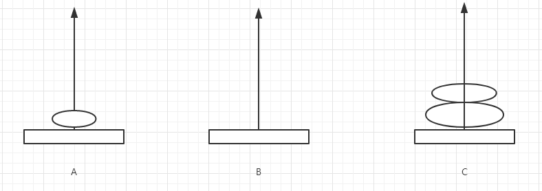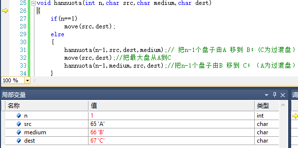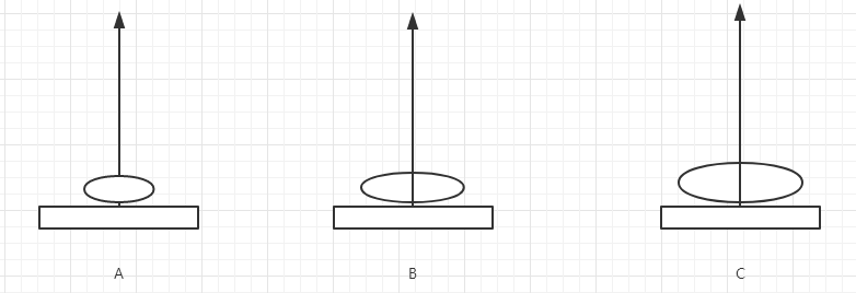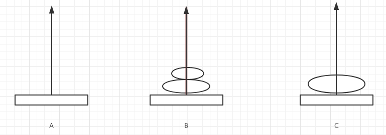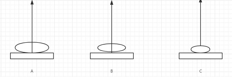 然后再以n=1进入递归 hannuota(n-1,medium,src,dest);//把n-1个盘子由B 移到 C;(A为过渡盘)