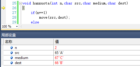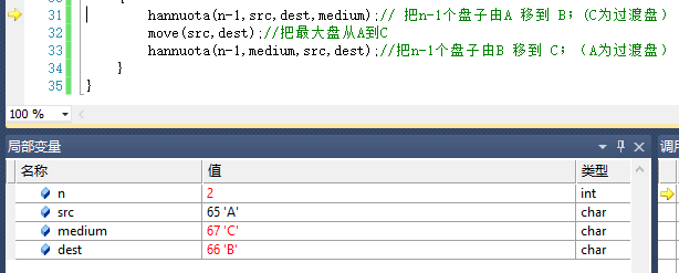 以n=2进入递归 hannuota(n-1,src,dest,medium);// 把n-1个盘子由A 移到 B;(C为过渡盘)