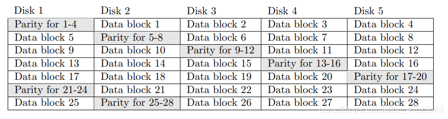 The parity block moves between the disks, starting at the first disk, and moving to the next one in order. For instance, if there were five disks and 28 data blocks were stored on them, they would be arranged as follows: