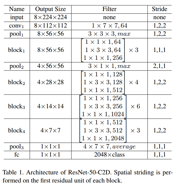 C2D模型能够取出鲁棒性的空间特征,但是只用了很简单的策略将空间和时间特征结合在一起。在本文中,作者以C2D为baseline模型,以ResNet为骨架网络,构建了一个网络结构。