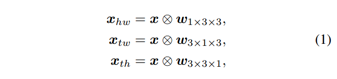 输入的特征大小为T*H*W*C1, C1为输入特征的通道数,三个视角的卷积操作可以表示为: