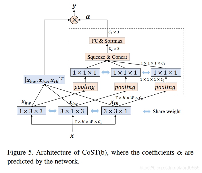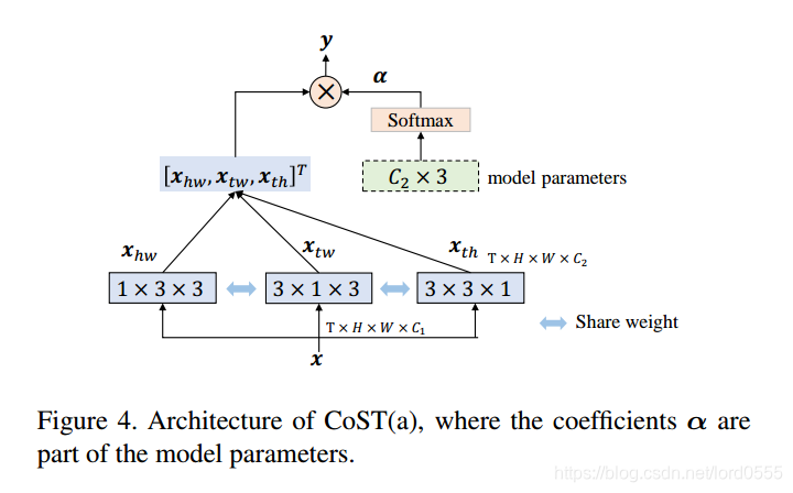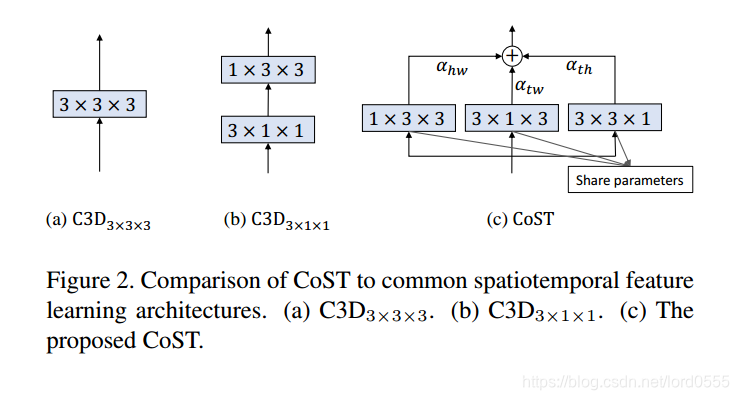 下图对比了CoST操作和C3D3*3*3和C3D3*1*1,c3D3*1*1,C3D3*3*3利用3D卷积将时间和空间特征联合提取出来,C3D3*1*1首先用3*1*1的卷积核提取时间上的特征,然后用1*3*3的卷积核提取空间特征。作者用3个3*3*3的2D卷积核从三个视角分别进行卷积操作,然后通过加权求和将三个特征图进行融合,注意,这里的三个卷积核参数是共享的,参数可以通过端到端的方法进行训练。