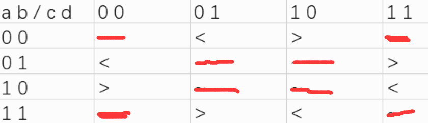这个肯定是要按位处理,从高到低,那么a,b的这一位的组合也就四种(0,0)(0,1)(1,0)(1,1),我们想要确认出来,从下表可以看出,可以询问c,d这一位分别为(0,1)或者(1,0)各一次,如果结果不一样就可以确定这一位,但是如果是一样但是是不确定的的话,那么也就是说,两个其中一个这一位一定是1,可是怎么判断谁是1呢,这就要从两个数字的大小来判断。