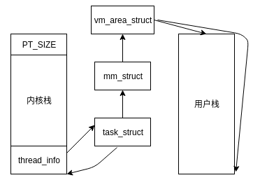 说明:1.内核栈的底端为thread_info结构体,栈顶开始为堆栈区,其中PT_SIZE为保存进程现场信息的区域。其中task变量指向进程的task_struct进程管理结构体。该结构体按ORDER分配,直接分配物理页。