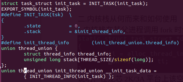 2.task_struct为进程管理结构体,其中stack变量指向栈首地址。该结构体属于slab分配。