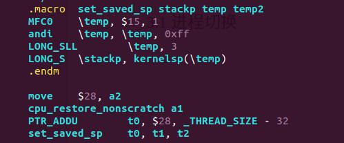 在进程切换时将进程内核栈的低地址(thread_info的地址)存放如$28寄存器,同时计算好栈顶指针存放如全局变量kernelsp中。