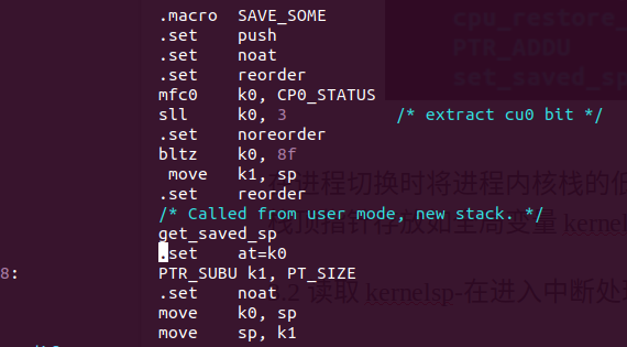 在保存现场时,如果是用户态进入内核态,首先通过get_saved_sp读取栈指针,然后保存现场。