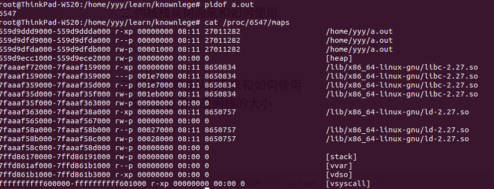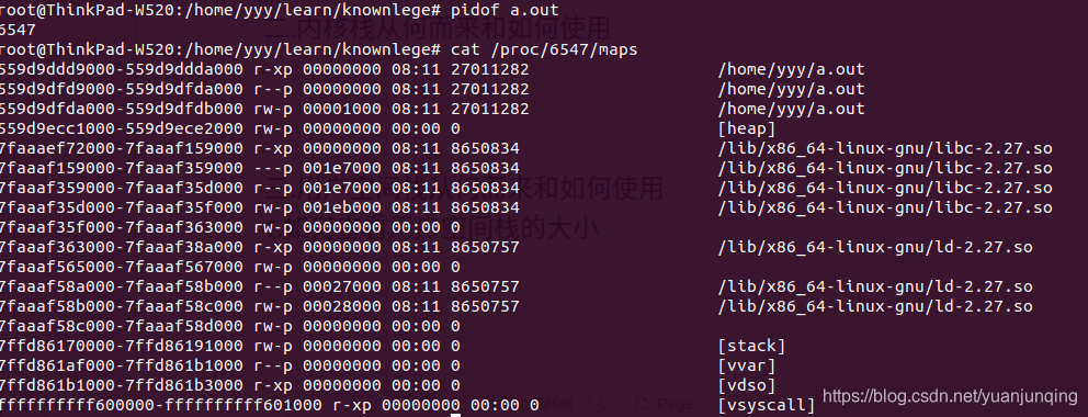 说明:pthread的栈空间使用的是父进程堆区域上的空间。线程的mm结构体与进程共享,所以查看线程内存区域没有意义,它与父进程共享。