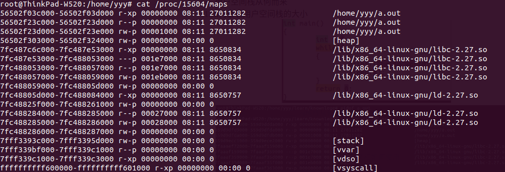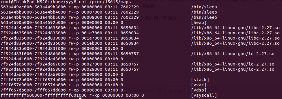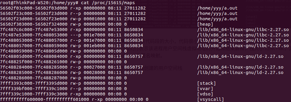 [stack]行表示该进程用户空间栈虚拟地址的开始和结束解释,栈大小128K+4K,其中[]代表该vma为匿名映射。