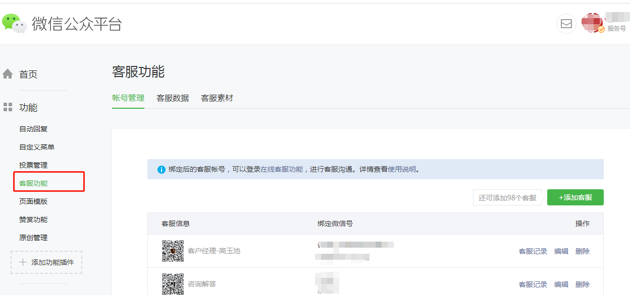2.登录服务号,找到这个客服功能。目前我这个服务号有俩个客服,我现在需要获取这俩个客服的聊天记录。