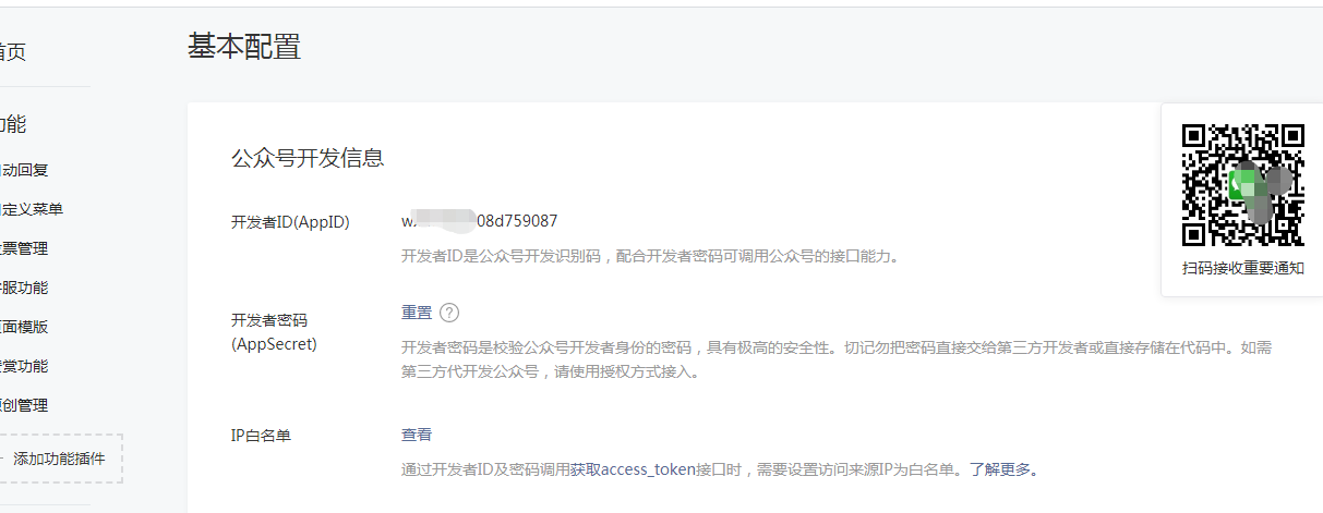 其中开发者id 和开发者密码用来获取AccessToken , 要配置IP白名单,不然调用客户聊天记录失败。