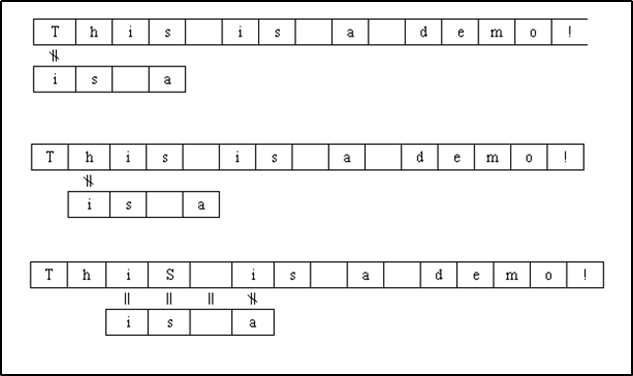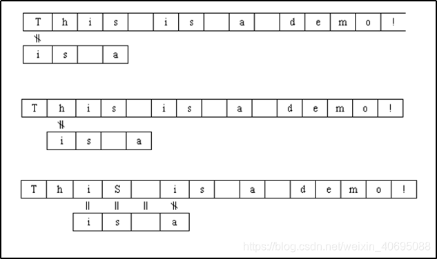核心思想:主串S和子串T,S[1]和T[1]比较,S[2]与T[2]比较,直到S[n]与T[n]都是相等的为止,若S[i]与T[i]不相等,则子串向右移动一个(一个字符)继续比较。