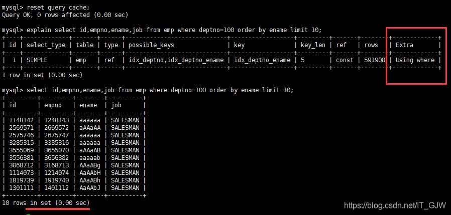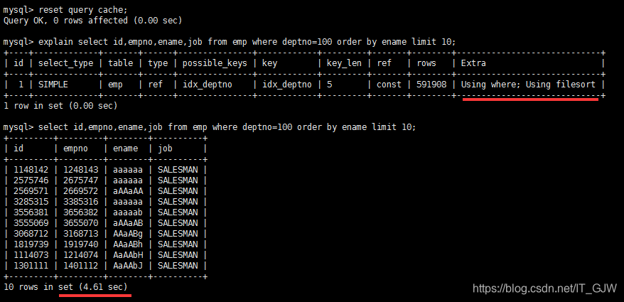 上述查询中要根据ename进行排序,由于该字段上无索引,因此使用到了文件排序
