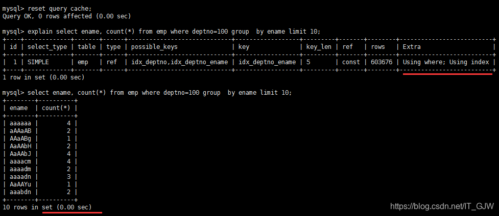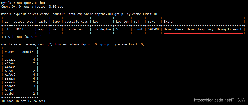 上述查询中要根据ename排序,但该字段上并无索引,因此出现了Using filesort和Using temporary,优化该查询,可以建立(deptno,ename)联合索引=,建立索引后的查询计划如下