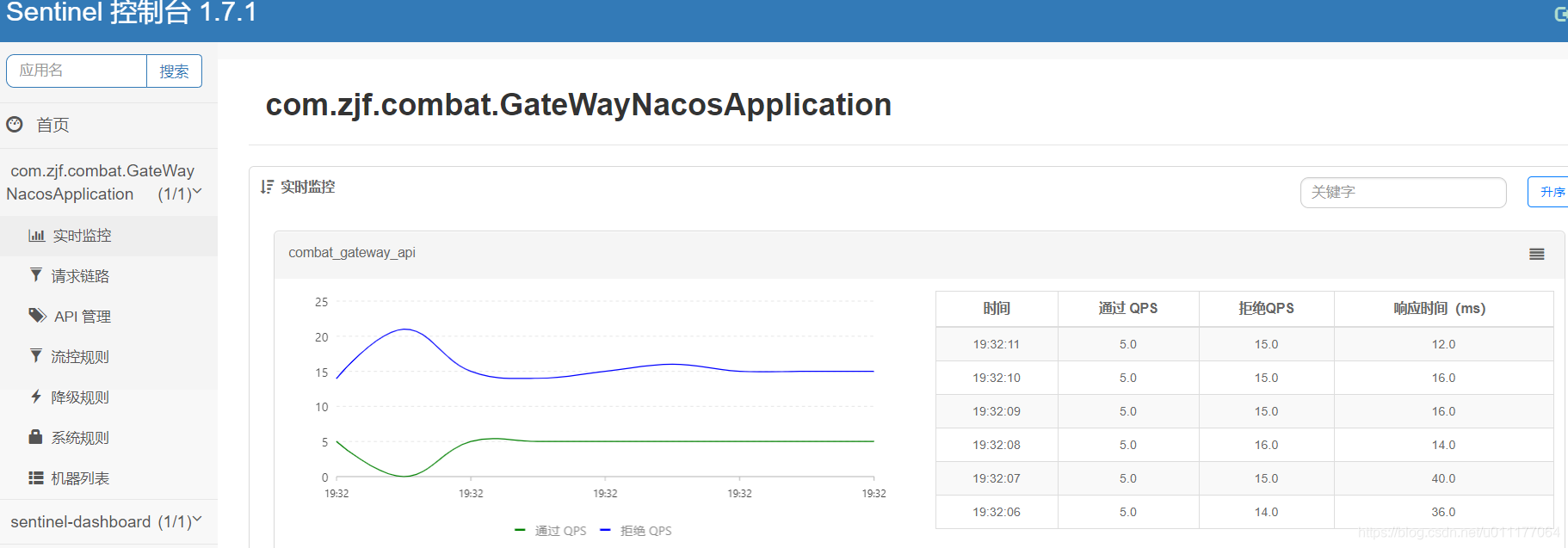 可以非常直观地看到,Sentinel把流量限制在 5 QPS (每秒允许5次请求),其余的15 都被限制了。