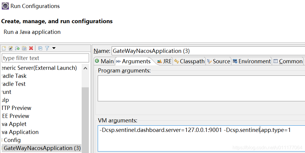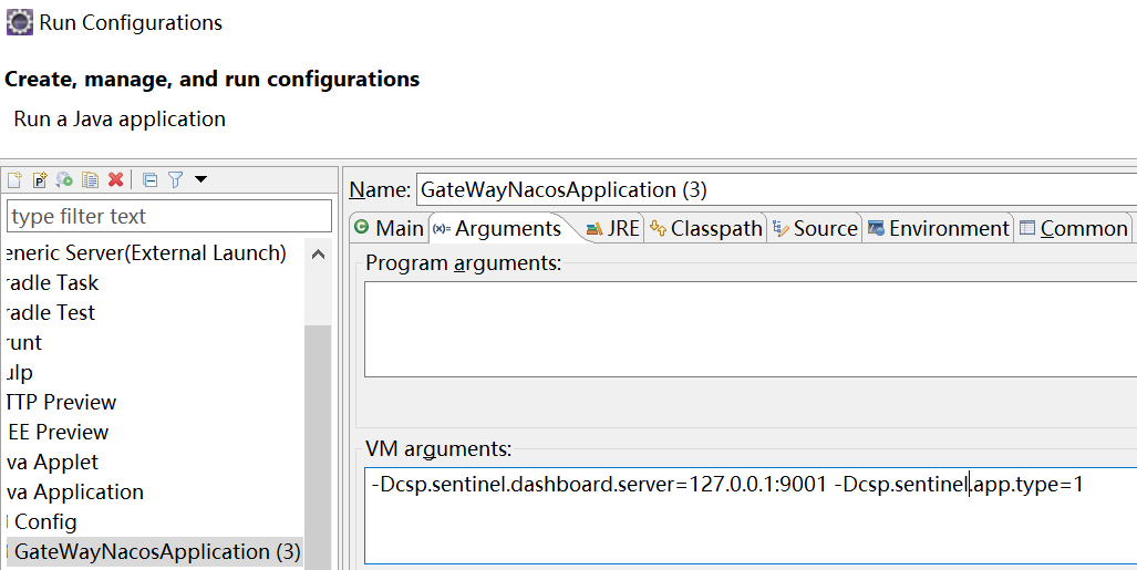 然后启动我们的网关工程,启动前在【Run】-【Run Configuartion】 中加入 VM参数