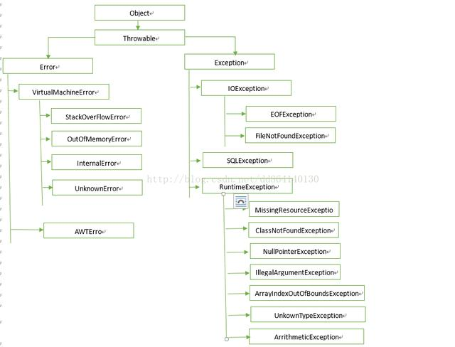 异常是指由于各种不期而至的情况,导致程序中断运行的一种指令流,如:文件找不到、非法参数、网络超时等。为了保证正序正常运行,在设计程序时必须考虑到各种异常情况,并正确的对异常进行处理。异常也是一种对象,java当中定义了许多异常类,并且定义了基类java.lang.Throwable作为所有异常的超类。Java语言设计者将异常划分为两类:Error和Exception,其体系结构大致如下图所示: