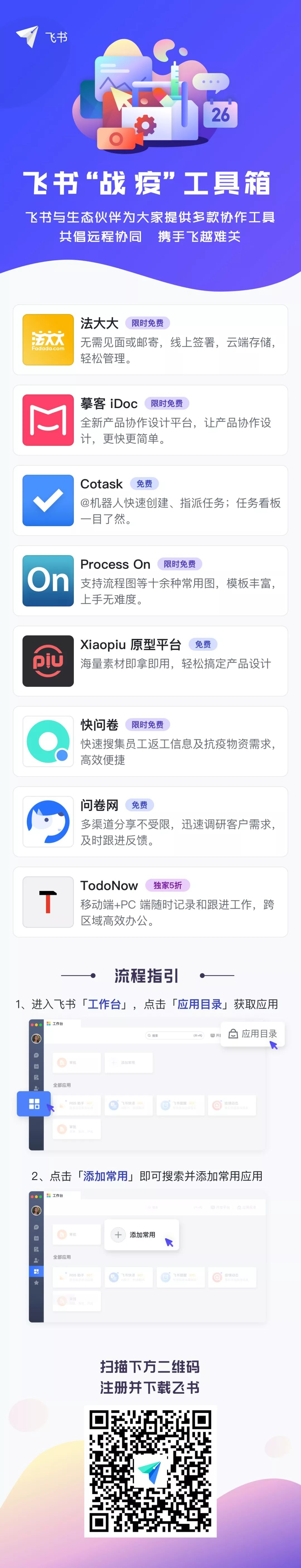 面对疫情期间企业员工远程办公的种种问题,飞书与生态伙伴为大家提供了多款协作工具,更有限时免费及独家折扣优惠,共倡远程协同,携手飞越难关!