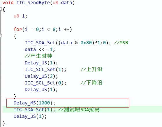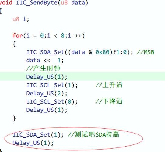依旧不甘心,测试时在8个bit发送完成后,在SCL低电平期间将SDA设置为高电平,所有通讯都会故障,这个就解释不通了,理论上IIC在SCL为低电平时,SDA是可以变动的,但是这个1貌似会影响到之后的ACK低电平。