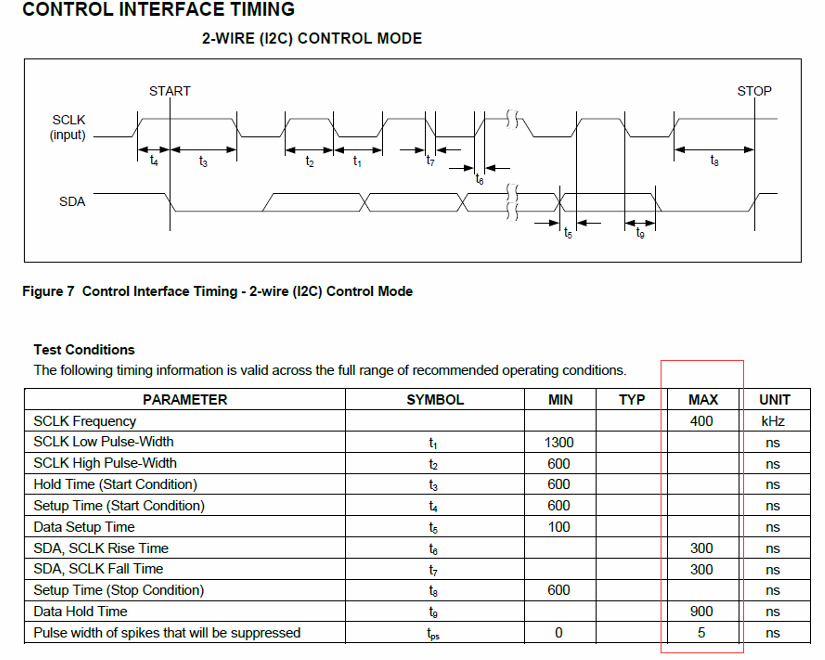 从WM8994的手册中,看到时钟只限制了最大速度400K,并没有最低限制,同步通讯,理论上这个地方的延时都不会有影响,而且在SCL为低电平期间,是允许SDA变化的
