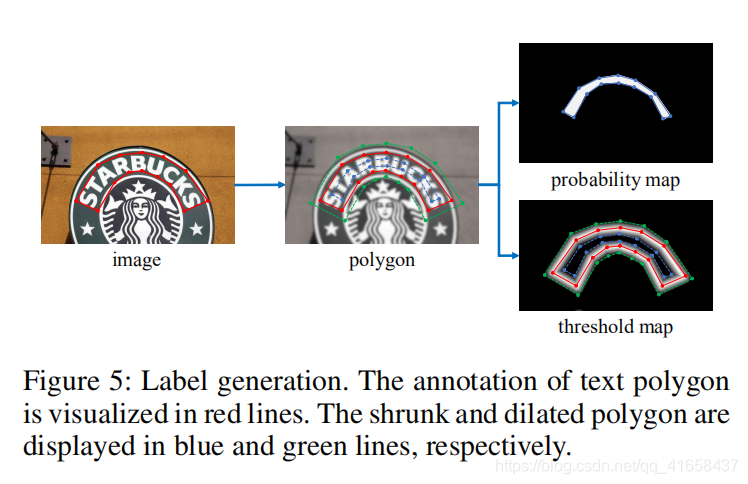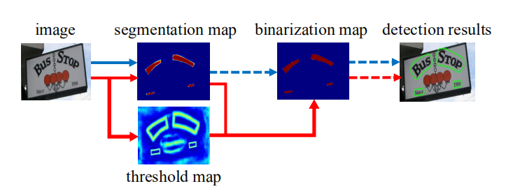 图中蓝色箭头是传统方法的过程,红色箭头是文中方法的过程,可见二值图是由预测图和阈值图计算得来的。