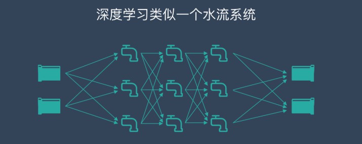 假设深度学习要处理的信息是“水流”,而处理数据的深度学习网络是一个由管道和阀门组成的巨大水管网络。网络的入口是若干管道开口,网络的出口也是若干管道开口。这个水管网络有许多层,每一层由许多个可以控制水流流向与流量的调节阀。根据不同任务的需要,水管网络的层数、每层的调节阀数量可以有不同的变化组合。对复杂任务来说,调节阀的总数可以成千上万甚至更多。水管网络中,每一层的每个调节阀都通过水管与下一层的所有调节阀连接起来,组成一个从前到后,逐层完全连通的水流系统。