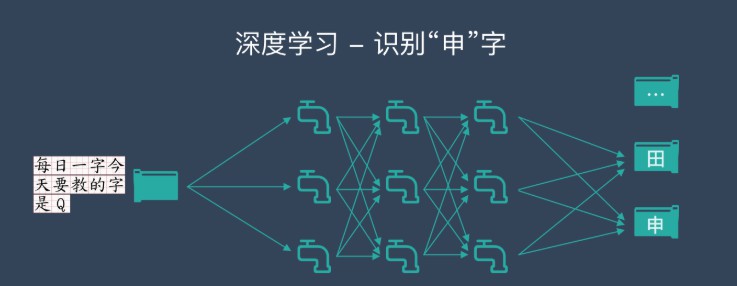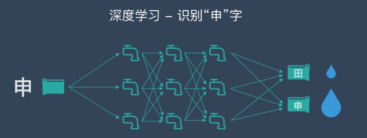 下一步,学习“申”字时,我们就用类似的方法,把每一张写有“申”字的图片变成一大堆数字组成的水流,灌进水管网络,看一看,是不是写有“申”字的那个管道出口流水最多,如果不是,我们还得再调整所有的阀门。这一次,要既保证刚才学过的“田”字不受影响,也要保证新的“申”字可以被正确处理。
