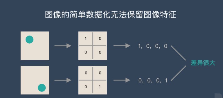 假如有圆形是1,没有圆形是0,那么圆形的位置不同就会产生完全不同的数据表达。但是从视觉的角度来看,图像的内容(本质)并没有发生变化,只是位置发生了变化。