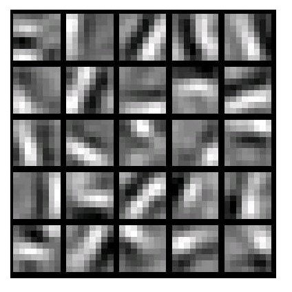 在具体应用中,往往有多个卷积核,可以认为,每个卷积核代表了一种图像模式,如果某个图像块与此卷积核卷积出的值大,则认为此图像块十分接近于此卷积核。如果我们设计了6个卷积核,可以理解:我们认为这个图像上有6种底层纹理模式,也就是我们用6中基础模式就能描绘出一副图像。以下就是25种不同的卷积核的示例: