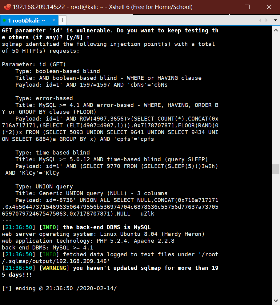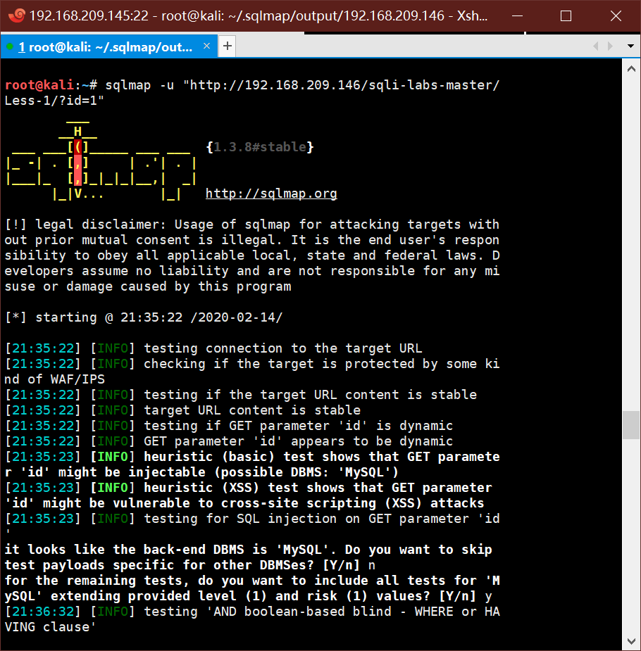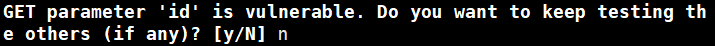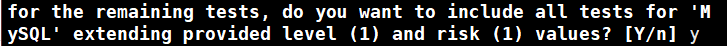 第二处交互的地方是说 对于剩下的测试,问我们是否想要使用扩展提供的级别(1)和风险(1)值的“MySQL”的所有测试吗? 我们选择 y。