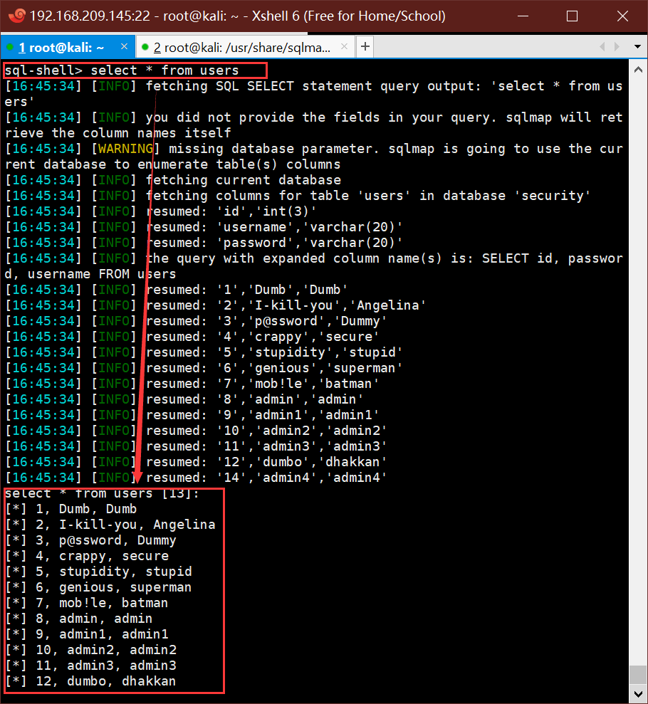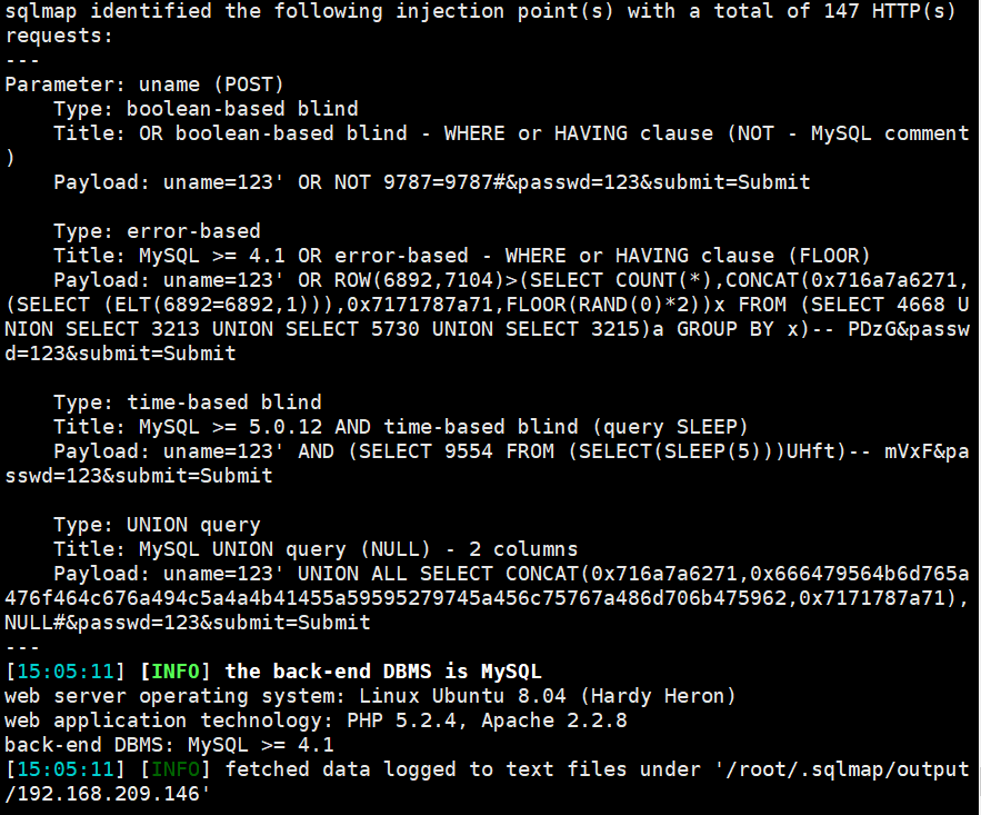 sqlmap -u "http://192.168.10.1/sqli/Less-11/?id=1" --data="uname=admin&passwd=admin&submit=Submit" #抓取其post提交的数据填入