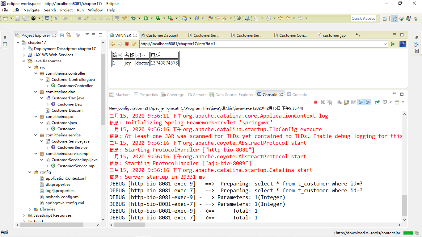 将项目发布到Tomcat服务器并启动,在浏览器中访问地址http://localhost:8081/chapter17/findCustomerById?id=1,显示效果如下