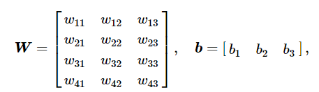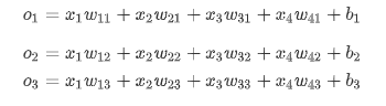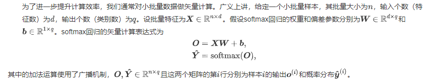 为了提高计算效率,我们可以将单样本分类通过矢量计算来表达。在上面的图像分类问题中,假设softmax回归的权重和偏差参数分别为: