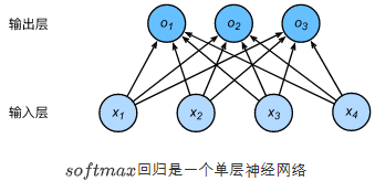 下图用神经网络图描绘了上面的计算。softmax回归同线性回归一样,也是一个单层神经网络。由于每个输出o1,o2,o3o1,o2,o3的计算都要依赖于所有的输入x1,x2,x3,x4x1,x2,x3,x4,softmax回归的输出层也是一个全连接层。