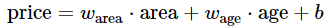 这里以房价预测为例,假设价格只取决于房屋状况的两个因素,即面积(平方米)和房龄(年)。线性回归假设输出与各个输入之间是线性关系,考虑通过房屋的面积Area与房龄Age来预测房价Price,其中w和b为未知的模型参数,即需要学习的参数。