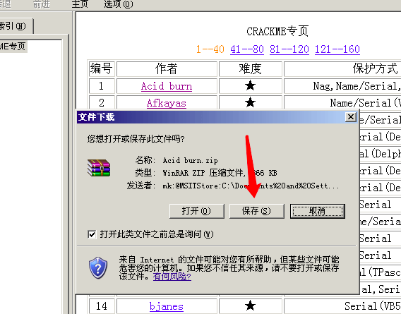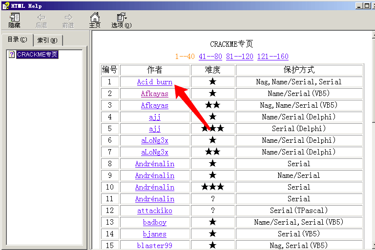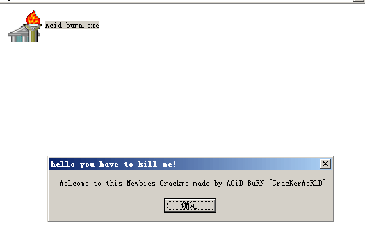 将上面链接中的160个CrackMe的打包文件下载下来之后, 打开该chm, 选择第一个Acid burn, 下载保存到本地, 然后解压, 运行其中的 exe 程序