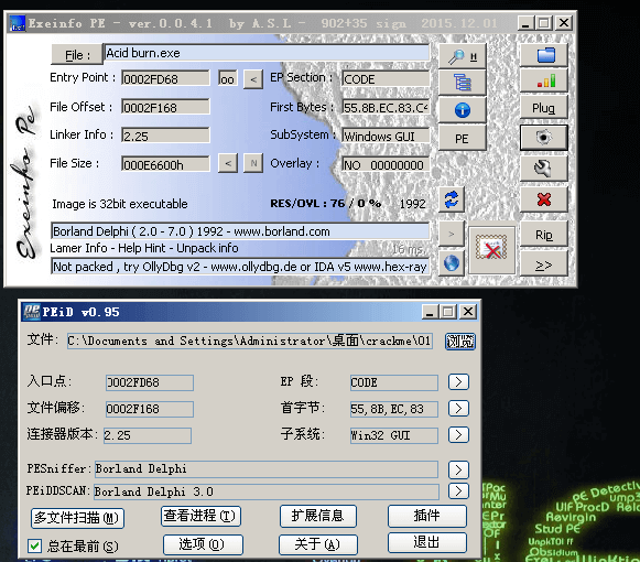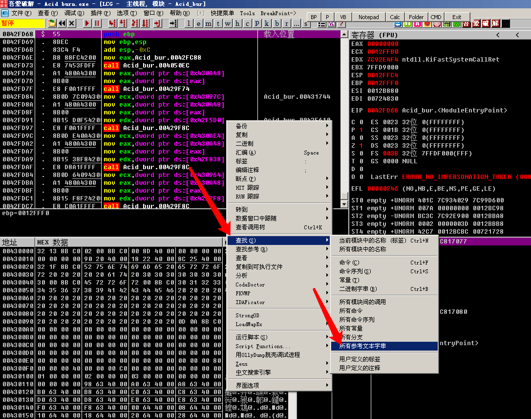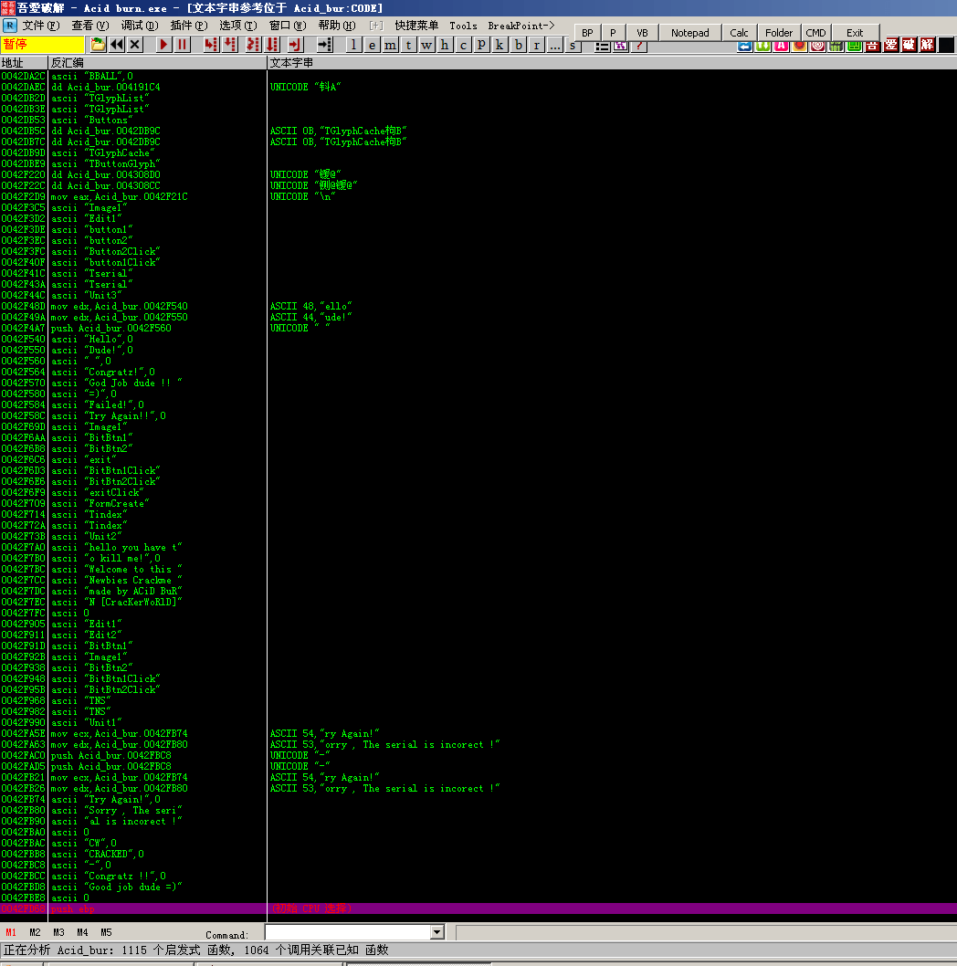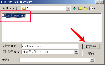 可以从这个字符串入手, 启动OllyDbg软件,选择菜单的文件-> 打开-> 选择Acid burn.exe