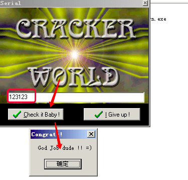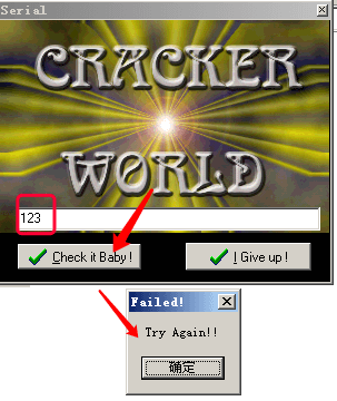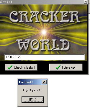 点击进去后发现有一个输入框,提醒你输入序列号,然后点击Check it Baby,程序会进行校验,校验失败会弹出下面窗口,提示你Failed!